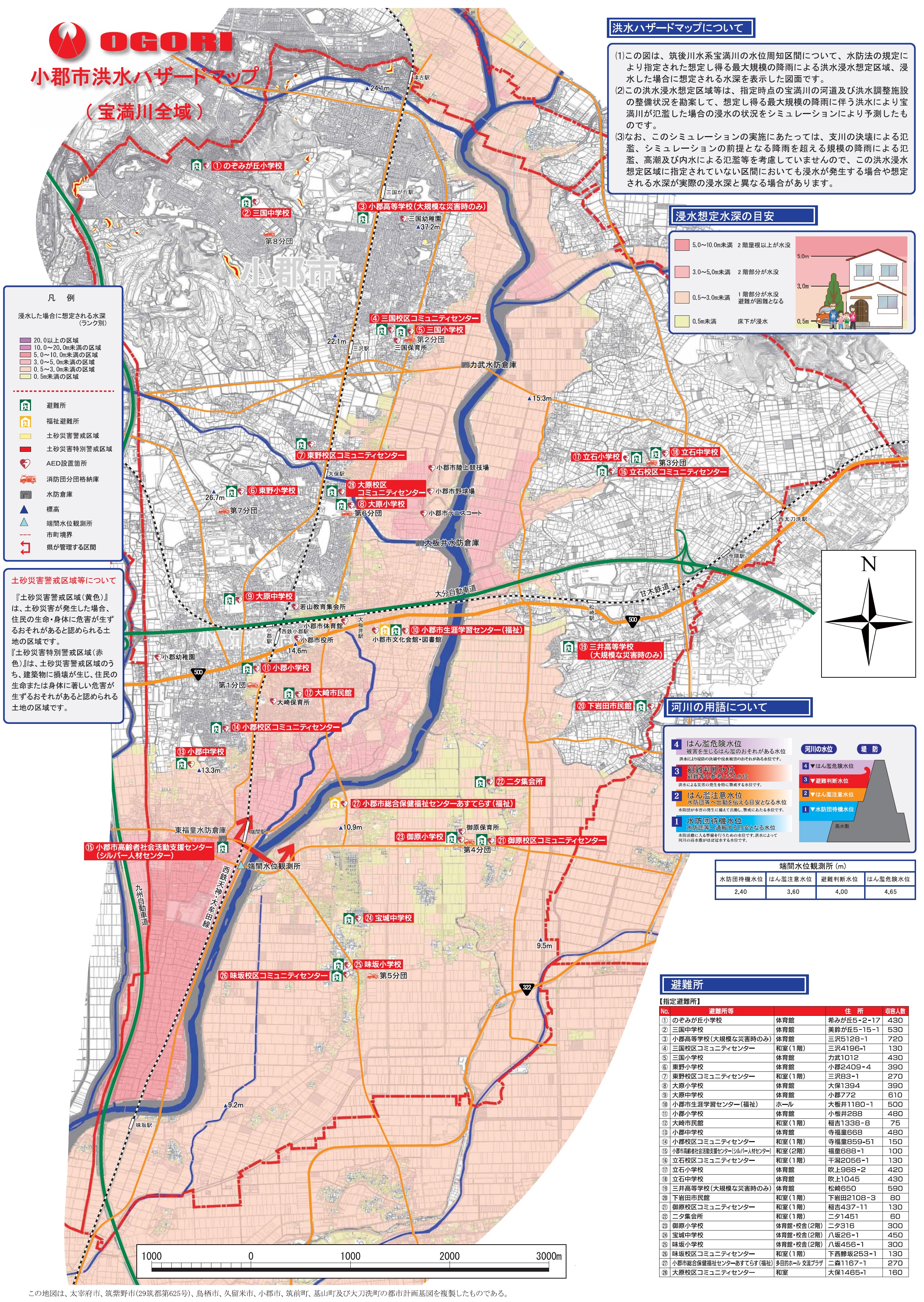 宝満川の洪水浸水想定区域が見直されたことに伴い、平成31年4月に小郡市ハザードマップを更新しました。お住まいの地域の浸水想定や、お近くの指定避難所等をご確認ください。主な変更点・追加箇所は、下記のとおりです。