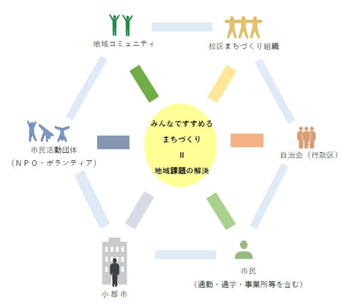小郡の暮らしに関わる人・自治会・校区まちづくり組織・地域コミュニティ・市民活動団体・事業所など、多様な担い手がつながり、それぞれの役割を果たしながら、みんなでまちづくりをすすめます。