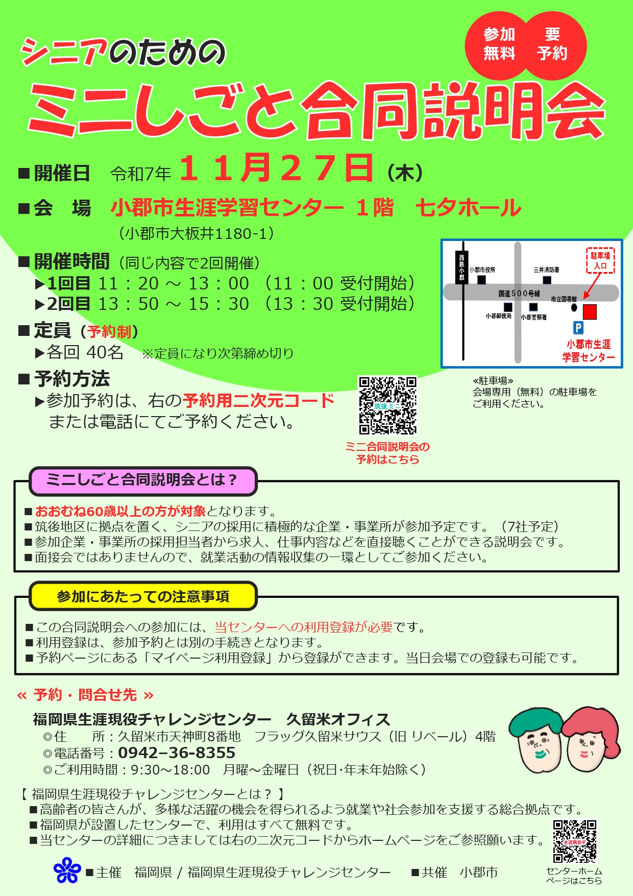 筑後地区に拠点を置く、シニアの採用に積極的な企業・事業所が参加し、採用担当者から求人内容などを直接聞くことができます。