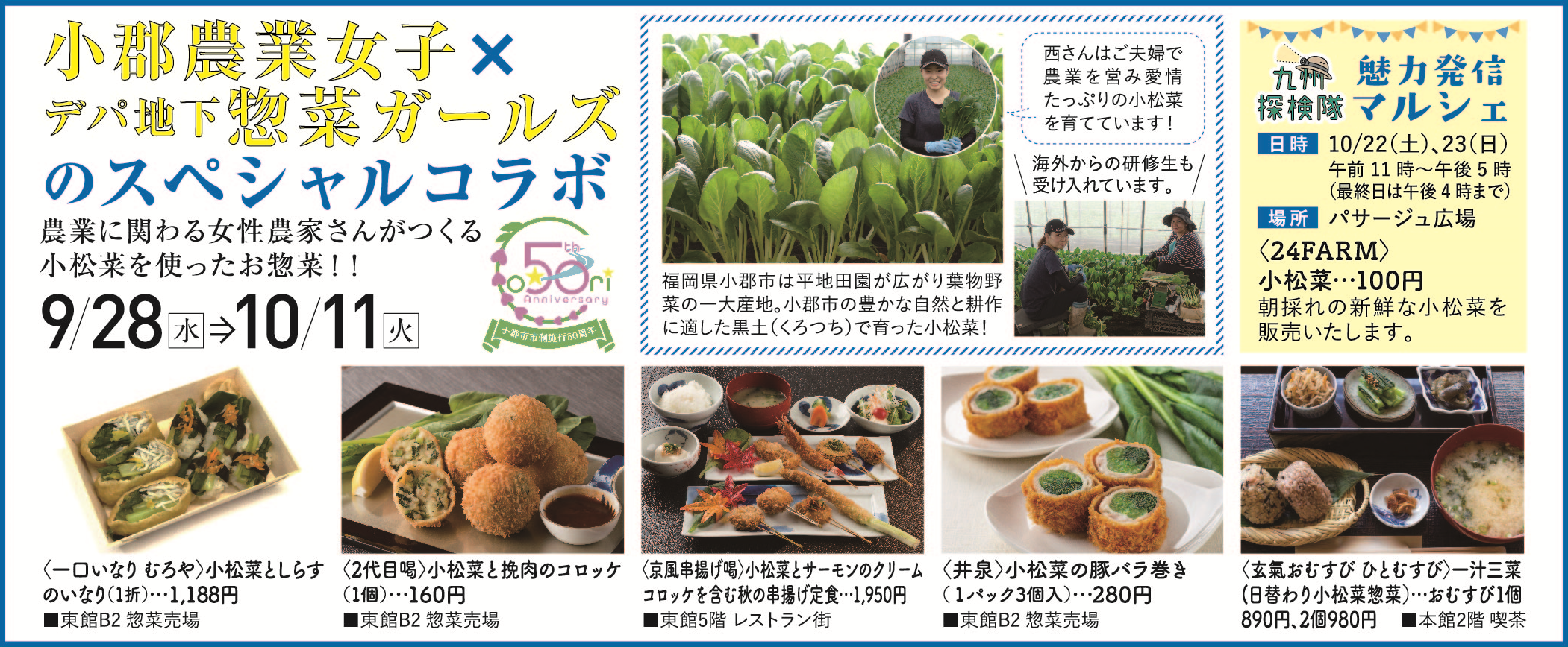 大丸店内の人気5店舗が、小松菜が主役の限定メニューを考案。小郡の豊かな自然の中で育ったシャキシャキの小松菜が、プロの料理人によってますます美味しくなりました。